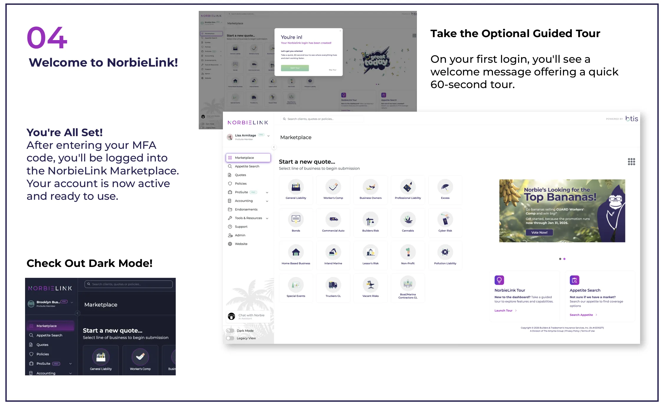 NorbieLink is BTIS's next-generation agent portal designed to deliver faster workflows, smarter tools, and an agent-first experience. It replaces the current portal with modern features including individual logins, AI-powered appetite search, enhanced admin controls, and seamless integration with ProSuite tools.