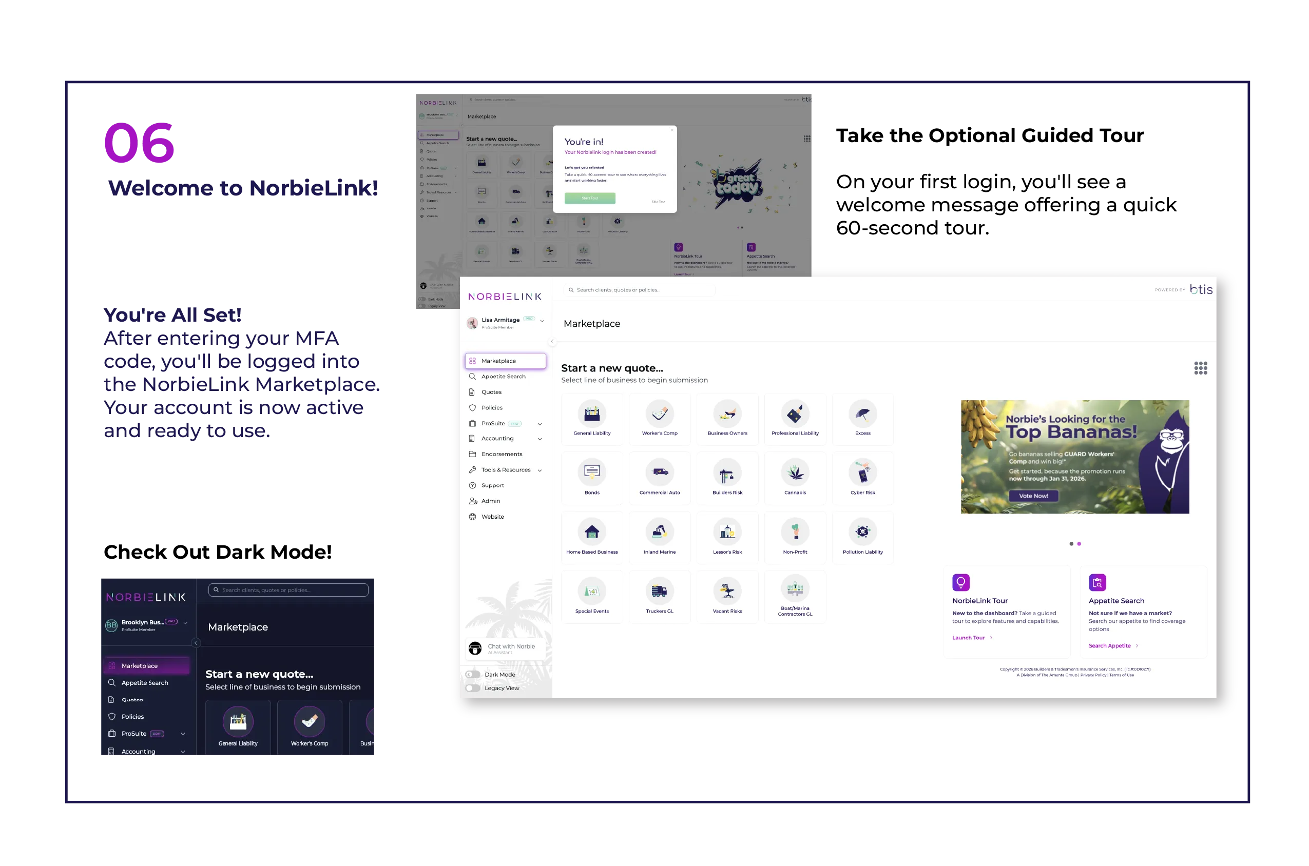 NorbieLink is BTIS's next-generation agent portal designed to deliver faster workflows, smarter tools, and an agent-first experience. It replaces the current portal with modern features including individual logins, AI-powered appetite search, enhanced admin controls, and seamless integration with ProSuite tools.